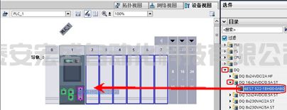 6.成功插入PLC后,STEP 7 Professional V12 軟件會自動跳轉(zhuǎn)到設(shè)備視圖。接下來我們要做的是在主機架上依次插入一個16通道的數(shù)字量輸出擴展模塊和一個數(shù)字量輸入擴展模塊。首先,添加DQ模塊:在“設(shè)備視圖”右側(cè)的產(chǎn)品目錄中,依次點擊“DQ”、“DQ 16*24VDC/0.5A ST”左側(cè)的小箭頭展開項目樹,然后用鼠標點中訂貨號“6ES7 522-1BH00-0AB0”,按住鼠標左鍵不放,將DQ模塊拖拽到2號槽位上,松開鼠標: