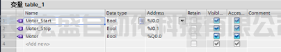 ----2.在變量表中,我們定義地址I0.0的名稱是“Moto_Start”, 地址I0.1的名稱是“Moto_Stop”, 地址Q0.0的名稱是“Moto”。