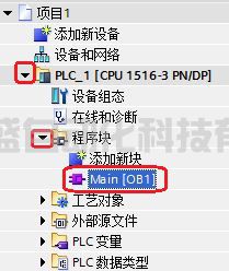10.接下來我們開始編程:依次點擊軟件界面左側(cè)的項目樹中的“PLC_1[CPU 1516-3PN/DP]”、“程序塊”左側(cè)的小箭頭展開結(jié)構(gòu),再雙擊“Main[OB1]”打開主程序: