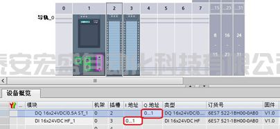 8.設(shè)備組態(tài)至此已經(jīng)完成,在項目視圖下方的“設(shè)備概覽”中,我們可以查看到系統(tǒng)默認分配的數(shù)字量輸出地址是QB0~QB1,數(shù)字量輸入的地址是IB0~IB1: