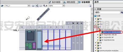 7.現(xiàn)在我們再插入一個DI模塊:在“設(shè)備視圖”右側(cè)的產(chǎn)品目錄中,依次點擊“DI”、“DI 16*24VDC HF”左側(cè)的小箭頭展開項目樹,然后用鼠標點中訂貨號“6ES7 521-1BH00-0AB0”,按住鼠標左鍵不放,將DI模塊拖拽到3號槽位上,松開鼠標: