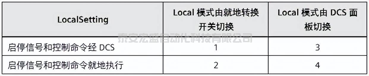 談到電機(jī)肯定會涉及到模式切換:就地、遠(yuǎn)程。遠(yuǎn)程/就地模式的切換及就地啟動方式,各現(xiàn)場因?qū)嶋H電氣控制回路設(shè)計不同,需求也可能不盡相同。例如有的現(xiàn)場遠(yuǎn)程/就地切換通過現(xiàn)場轉(zhuǎn)換開關(guān)實(shí)現(xiàn),就地啟停不經(jīng)過PLC,而別的現(xiàn)場同樣切換方式下可能就地啟停命令經(jīng)PLC發(fā)出。還有的現(xiàn)場遠(yuǎn)程/就地模式切換在DCS側(cè)面板中實(shí)現(xiàn),現(xiàn)場沒有轉(zhuǎn)換開關(guān)。MotL充分考慮了這種需求,通過LocalSetting設(shè)置為不同的值可以滿足不同的應(yīng)用場合。如下表所示: