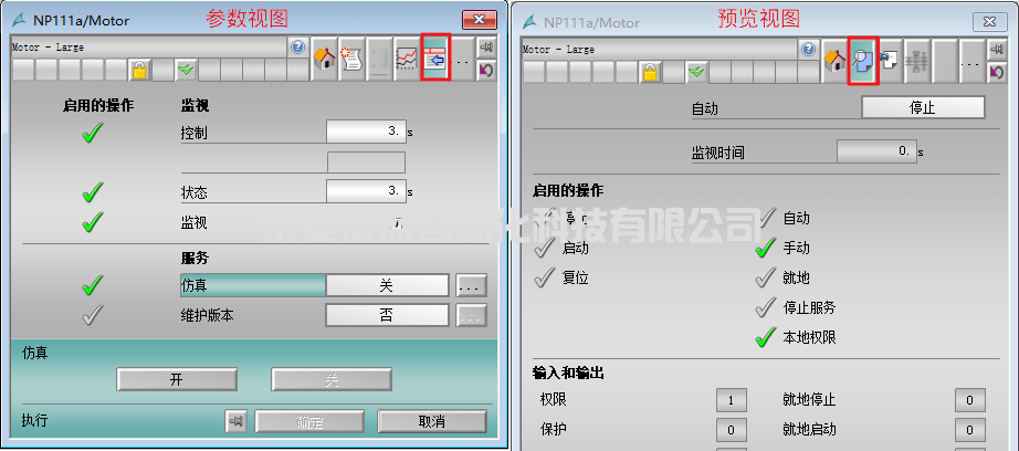 電機(jī)面板不止提供簡單的啟停和連鎖控制,還可以在參數(shù)面板設(shè)置監(jiān)視時間、仿真模式、維護(hù)發(fā)布等,另外預(yù)覽值視圖可以查看當(dāng)前模式和狀態(tài)、監(jiān)視時間、哪些操作可以啟用、關(guān)鍵參數(shù)的輸入和輸出值等功能。