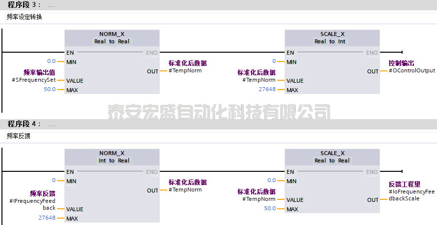 ③程序段3:使用標準化指令設定變頻器頻率和采集反饋的頻率。