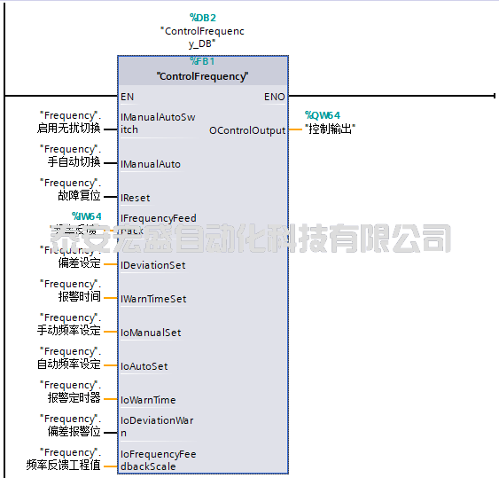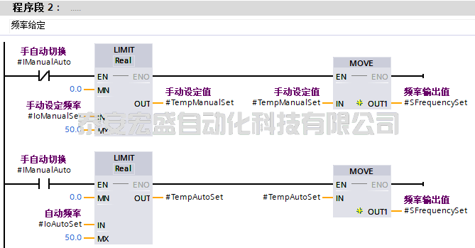 ②程序段2:當HMI上的“手自動切換”按鈕FALSE時,“手動設定頻率”生效,變頻器根據(jù)手動設定的頻率運行;當HMI上的“手自動切換”按鈕TRUE時,變頻器根據(jù)自動設定的頻率運行(可以根據(jù)現(xiàn)場的PID運算等參數(shù)給定)。使用LIMIT指令是為了限制給定的頻率值在0-50HZ之間,假如“手動設定頻率”或者“自動頻率”的值小于0或者大于50,“#TempManualSet”和“#TempAutoSet”會自動限制在0-50之間。小于0則用0替代,大于50則用50替代。