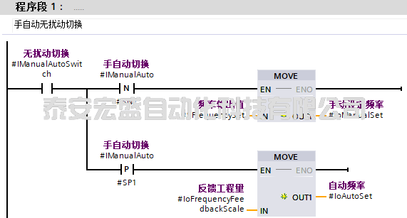 ①程序段1:當HMI上“無擾切換”按鈕為TRUE時,則是啟動無擾切換模式。此時HMI上的“手自動切換”按鈕,由自動轉(zhuǎn)換為手動模式檢測這個按鈕狀態(tài)下降沿,檢測到下降沿后,將頻率的輸出值賦值給手動設定頻率;由手動轉(zhuǎn)換為自動模式檢測這個按鈕狀態(tài)上升沿,檢測到上升沿后,將頻率的反饋值賦值給自動頻率。