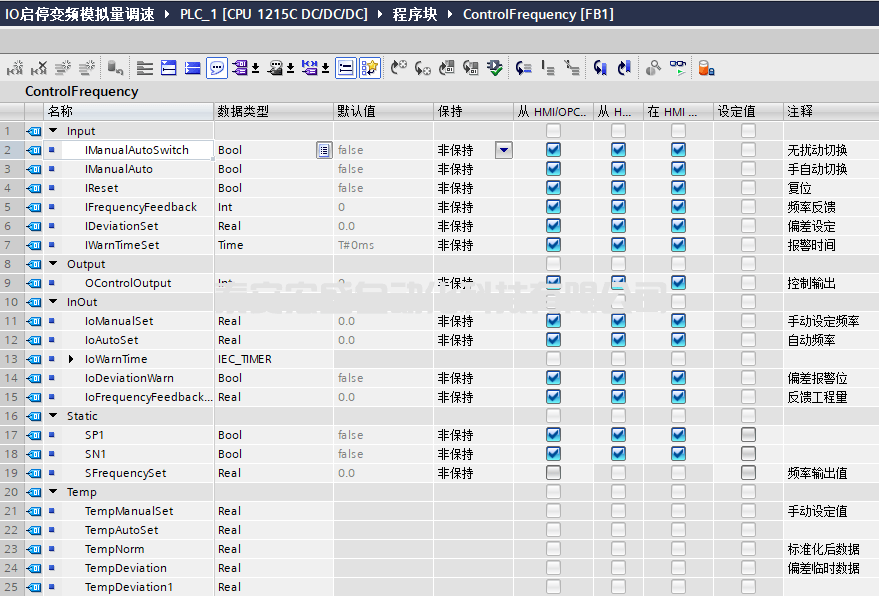 控制變頻器時,有很多種方式,比如通信、模擬量、開關(guān)量等方式。而在現(xiàn)場PLC控制變頻器時,可能會有手自動切換、頻率給定、頻率反饋、無擾動切換等功能需求。那么我們就可以利用S7-1200PLC的FB塊的功能,把上述功能進行封裝。