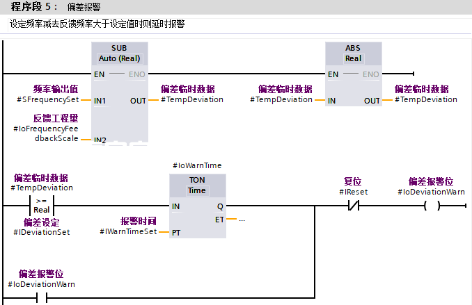 ④程序段4:當頻率的輸出值減去反饋值的絕對值大于所設定的偏差值,則延時一段時間報警。當偏差不在設定范圍內(nèi),則可以復位。