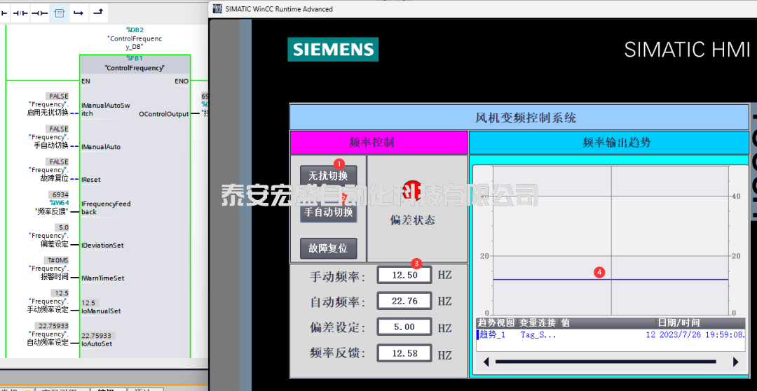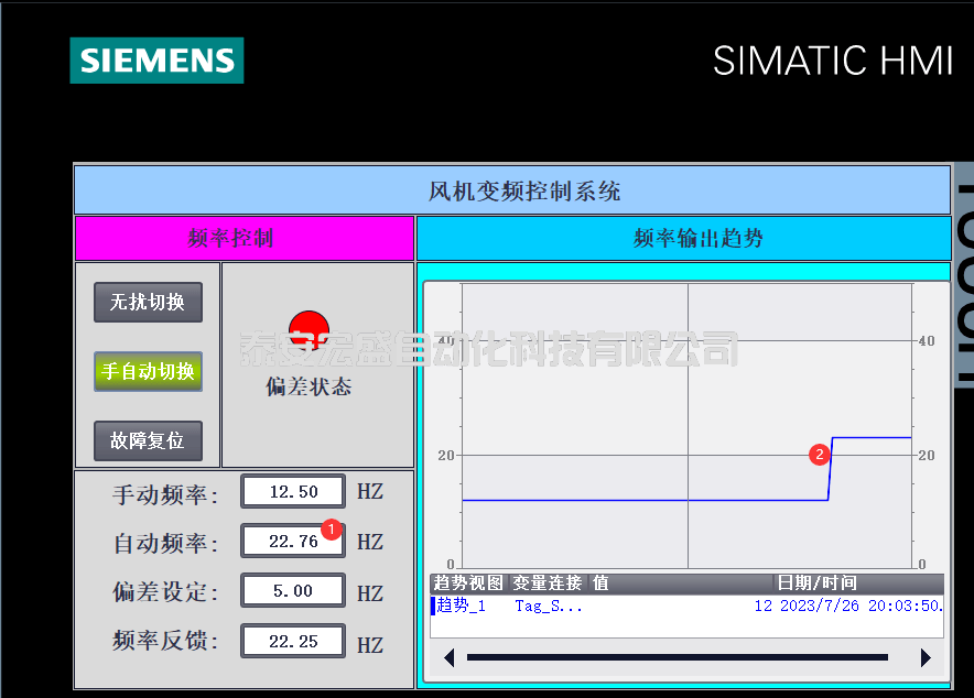 ①如圖1所示:HMI上“無擾切換”切換模式?jīng)]有啟用;“手自動切換”為FALSE,代表的是手動模式;手動頻率給定的是12.5HZ,頻率輸出曲線一直是在12.5HZ。當切換到自動模式,如圖2所示,頻率輸出為22.76HZ,曲線可以看出頻率輸出產(chǎn)生了較大的擾動。