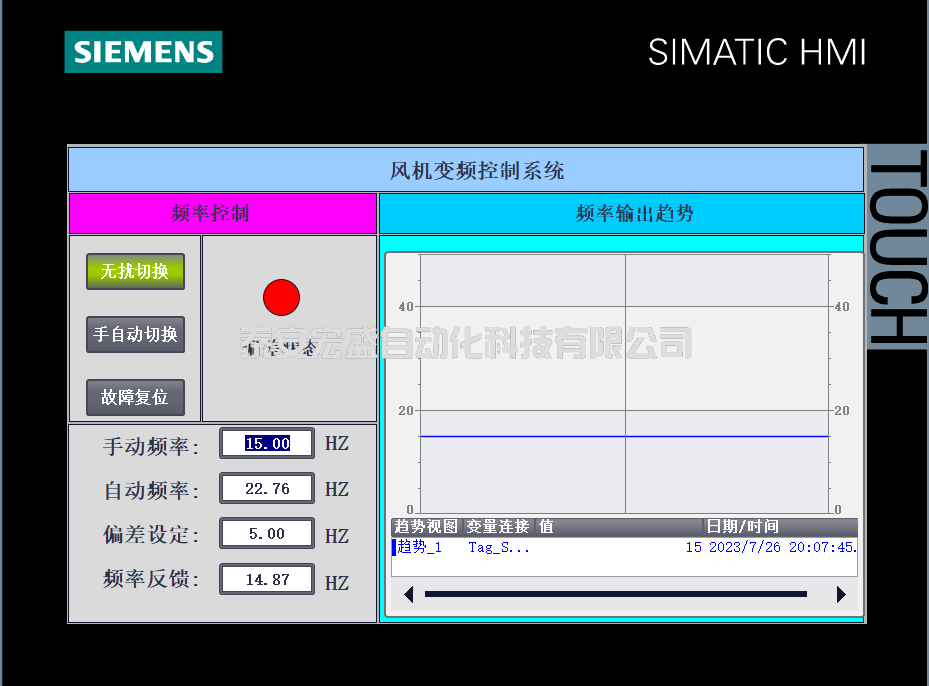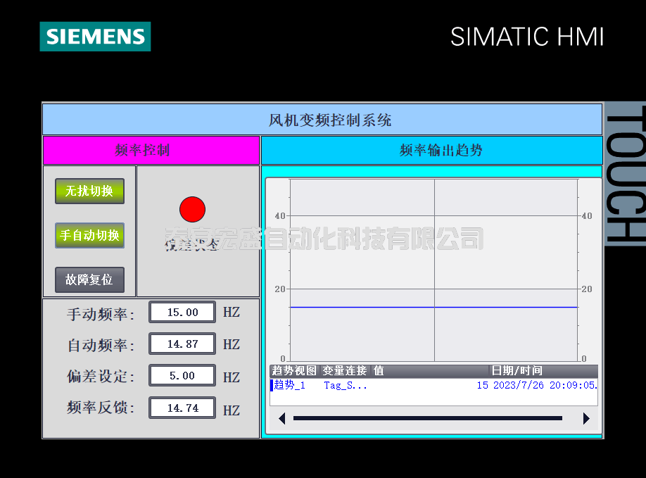 ②如圖3所示:HMI上“無擾切換”切換模式啟用;“手自動切換”為FALSE,代表的是手動模式;手動頻率給定的是15HZ,頻率輸出曲線一直是在15HZ。當切換到自動模式,如圖4所示,頻率反饋的值給到自動頻率值,曲線可以看出頻率輸出沒有產(chǎn)生擾動。