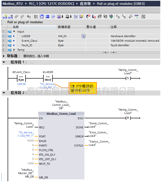 本例中Modbus RTU主站模塊安裝在分布式IO站點上,因此程序中需要考慮分布式IO站點故障、CM PTP 模塊插拔模塊等故障。分布式IO站點中插出、拔入模塊時,操作系統(tǒng)都會調(diào)用一次OB83。通過OB83接口區(qū)的輸入變量“16#Event_Class”判斷故障的模塊和類型:事件類型16#39表示模塊被拔出,事件類型16#38表示模塊被插入。CM PTP 模塊被重新插入的時候,需要在中斷OB83中調(diào)用Modbus_Comm_Load 指令對通信模塊進行重新組態(tài),如圖15所示。