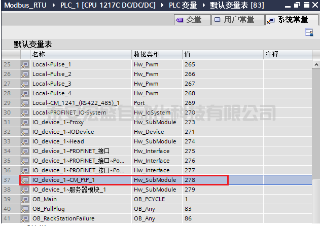 ②CM PTP模塊的硬件標識符也可以在"PLC變量"--->"系統(tǒng)常數(shù)"中查詢,如圖16所示: