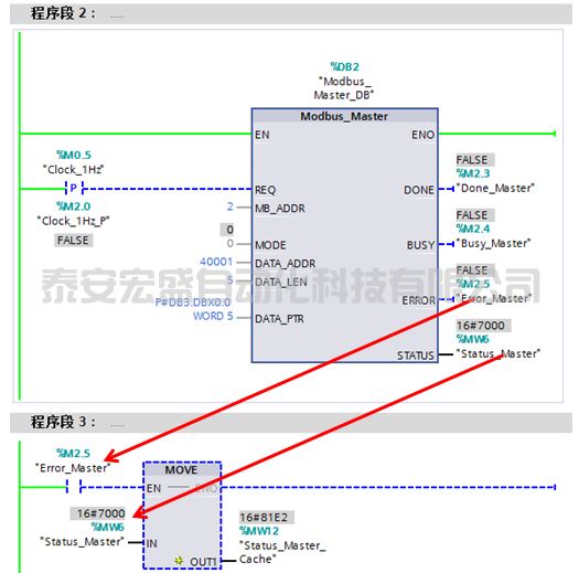 以Modbus_Master指令為例,當通信出現(xiàn)錯誤時,Modbus_Master指令的“ERROR”輸出位將變?yōu)?TRUE 但是只保持一個掃描周期,所以通過TIA 軟件程序監(jiān)控時無法查詢到錯誤。Modbus_Master指令“STATUS” 參數(shù)中的錯誤代碼僅在“ERROR” = TRUE 的掃描周期內(nèi)有效,為了獲取了Modbus RTU通信錯誤的錯誤代碼我們可以采用下圖19. 方式編程。