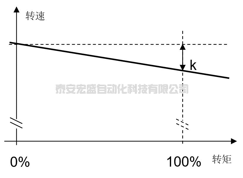 該方案不分主設(shè)備和從設(shè)備,每臺變頻器各自激活Droop功能。Droop輸入信號源采用自身的轉(zhuǎn)矩設(shè)定值。按照預(yù)先設(shè)置好的Droop系數(shù)得到一條Droop曲線,當(dāng)輸出轉(zhuǎn)矩增大時,輸出轉(zhuǎn)速隨之減小。Droop曲線如下圖所示: