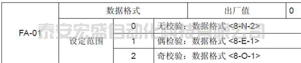由上圖可知,匯川變頻器數(shù)據(jù)格式有3種模式,默認值為0,本例選擇0。無校驗時,每個字節(jié)長度為11 位,其中1 位起始位,8 位數(shù)據(jù)位,2 位結(jié)束位。上位機與變頻器設定的數(shù)據(jù)格式必須一致,否則,通訊無法進行。