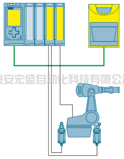 F-CPU 和激光掃描儀可通過(guò) PROFINET 與錯(cuò)誤安全“PROFIsafe”配置文件進(jìn)行通信??赏ㄟ^(guò)兩個(gè)傳感器(例如 SIRIUS 位置開(kāi)關(guān))來(lái)檢測(cè)機(jī)器人位置。