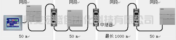 網(wǎng)絡(luò)中添加中繼器允許將網(wǎng)絡(luò)再延長 50m ,如果兩臺中繼器連接在一起,中間無其它節(jié)點,則可將網(wǎng)絡(luò)延長 1000m ,一個網(wǎng)絡(luò)中最多可以使用 9 個西門子中繼器。如圖 4. 使用 RS485 中繼器拓展網(wǎng)絡(luò)所示。