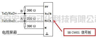 使用 SB CM01 信號板可用于連接 RS485 網(wǎng)絡(luò),當(dāng)信號板為終端通信節(jié)點時需要接終端電阻和連接偏置電阻,典型的電路圖如圖 6. SB CM01 信號板終端和偏置電阻接線圖所示。