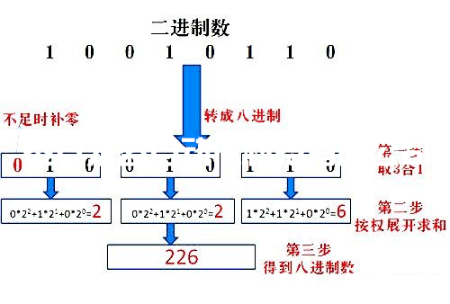 3位二進制數按權展開相加得到1位八進制數。注:3位二進制轉成八進制是從右到左開始轉換,不足時補0。如圖: