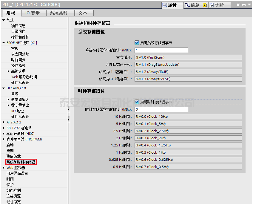 (4)另外,S7-1200 還提供了系統(tǒng)和時鐘存儲器功能,為了便于后續(xù)指令,建議使能該功能。在CPU “屬性”→“常規(guī)”→“系統(tǒng)和時鐘存儲器”使能系統(tǒng)和時鐘存儲器功能,如圖7所示。