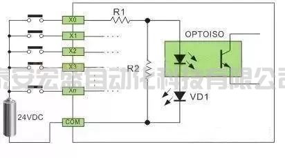 PLC 的數(shù)字量輸入接口并不復(fù)雜,PLC 為了提高抗干擾能力,輸入接口都采用光電耦合器來隔離輸入信號與內(nèi)部處理電路的傳輸。因此,輸入端的信號只是驅(qū)動光電耦合器的內(nèi)部 LED 導(dǎo)通,被光電耦合器的光電管接收,即可使外部輸入信號可靠傳輸。