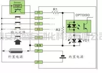 SOURCE源型為電流從輸入端流進,那么輸入端與電源正極相連即可,說明接口內(nèi)部的光電耦合器為單端共點為電源負極,可接PNP型傳感器。