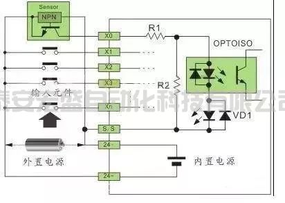 S/S端子與COM端不同的是,COM是與內(nèi)部電源正極或負極固定相連,S/S端子是非固定相連的,根據(jù)需要才與內(nèi)部電源或外部電源的正極或者負極相連。