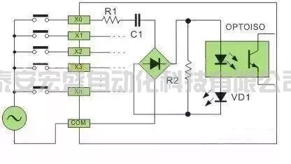 直流電可以由PLC內(nèi)部提供也可以外接直流電源提供給外部輸入信號的元件。R2在電路中的作用是旁路光電耦合器內(nèi)部LED的電流,保證光電耦合器LED不被兩線制接近開關(guān)的靜態(tài)泄漏電流導(dǎo)通。