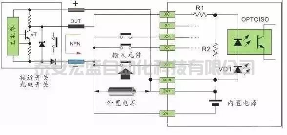 SINK漏型為電流從輸入端流出,那么輸入端與電源負極相連即可,說明接口內(nèi)部的光電耦合器為單端共點為電源正極,可接NPN型傳感器。